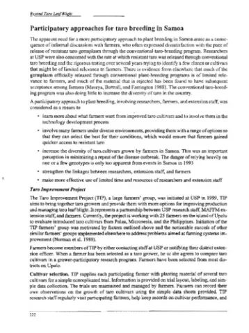The different factors that affect yield stability over time are discussed on the basis of results of numerous studies carried out at the exptl. station and on-farm levels. Among these are soil and climatic conditions, pests and diseases, use of different cultural practices (planting, spacing, cropping sytem, harvest time, double vs. single rows), plot size, and socioeconomic level of the farmer. Results of comparative yield trials using recommended vs. traditional cultural practices are also discussed. (CIAT)