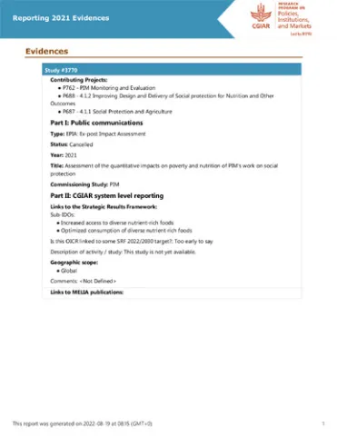 CGIAR Research Program on Policies, Institutions, and Markets. 2021. Assessment of the quantitative impacts on poverty and nutrition of PIM's work on social protection. Reported in Policies, Institutions, and Markets Annual Report 2021. MELIA.