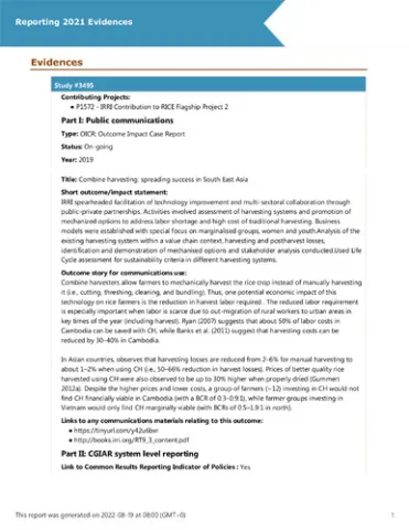 IRRI spearheaded facilitation of technology improvement and multi-sectoral collaboration through public-private partnerships. Activities involved assessment of harvesting systems and promotion of mechanized options to address labor shortage and high cost of traditional harvesting. Business models were established with special focus on marginalised groups, women and youth.Analysis of the existing harvesting system within a value chain context, harvesting and postharvest losses, identification and demonstration of mechanised options and stakeholder analysis conducted.Used Life Cycle assessment for sustainability criteria in different harvesting systems.