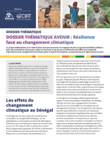 The Adaptation and Valorization of Entrepreneurship in Irrigated Agriculture (AVENIR) project aims to enhance the well-being and resilience of farming households in Senegal, particularly women and youth. The project focuses on smallholder farms that use irrigation and promotes affordable agricultural practices and technologies that can help farming systems become more resilient to a changing climate. This brief outlines the AVENIR approach used to strengthen climate resilience amongst rural farmers of Tambacounda and Sédhiou.