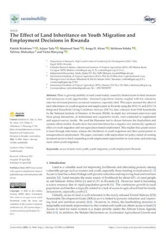 There is growing mobility of rural youth mainly caused by limited access to land resources and inadequacy of job opportunities. Increased population density coupled with low education rates has increased pressure on natural resources, especially land. This paper assessed the effect of land inheritance on youth migration and employment in Rwanda using the 2010/11 and 2013/14 Integrated Household Living Conditions Surveys (EICVs) data collected from 8160 households by the National Institute of Statistics of Rwanda (NISR). In-depth key informant interviews and focus group discussions, at institutional and cooperative levels, were conducted to supplement and support survey results. We used the Hausman test to choose between the fixed-effects and random-effects models. Results show that land inheritance has a negative and statistically significant effect on youth migration and non-agriculture-based employment. This implies that greater access to land through inheritance reduces the likelihood of youth migration and their participation in nonagricultural employment. The paper concludes with implications for policy aimed at creating increased access to land, expanding youth employment opportunities in rural areas, and reducing rural–urban youth migration.