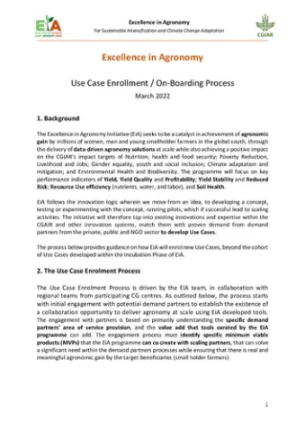 CGIAR. (2022). Excellence in Agronomy Use Case Enrollment / On-Boarding Process. Excellence in Agronomy For Sustainable Intensification and Climate Change Adaptation. Ibadan, Nigeria: IITA, (18 p.).