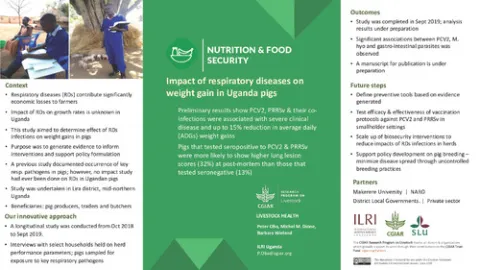 Oba, P., Dione, M.M. and Wieland, B. 2020. Impact of respiratory diseases on weight gain in Uganda pigs. Poster prepared for the Virtual Livestock CRP Planning Meeting, 8-17 June 2020. Nairobi, Kenya: ILRI.