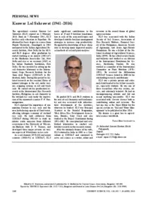 The agricultural scientist Kanwar Lal Sahrawat (KLS) expired on 3 February 2016. Born on 7 November 1941, KLS had his early education in Rajasthan. He obtained his basic degree in science from Punjab University, Chandigarh in 1962 and moved to the Indian Agricultural Research Institute, New Delhi for his M Sc and Ph D degrees. After graduation he started working as an analyst (1962–67) at the Hindustan Insecticides Ltd, New Delhi and also as an assistant (1967) at the Indian Standards Institution, New Delhi. He was involved in setting up the soil chemistry laboratory at the International Crops Research Institute for the Semi Arid Tropics (ICRISAT) in Hyderabad, India