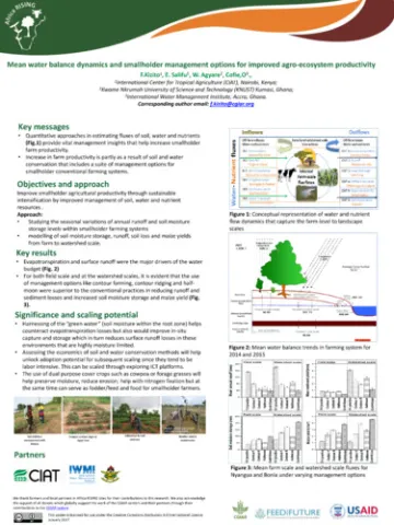Kizito, F., Salifu, E., Agyare, W. and Cofie, O. 2017. Mean water balance dynamics and smallholder management options for improved agro-ecosystem productivity. Poster prepared for the Africa RISING West Africa Review and Planning Meeting, Accra, 1-2 February 2017. Cali, Colombia: CIAT.