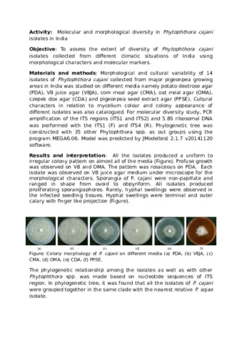 Morphological and cultural variability of 14 isolates of Phytophthora cajani collected from major pigeonpea growing areas in India was studied on different media namely potato dextrose agar (PDA), V8 juice agar (V8JA), corn meal agar (CMA), oat meal agar (OMA), czepek dox agar (CDA) and pigeonpea seed extract agar (PPSE). Cultural characters in relation to mycelium colour and colony appearance of different isolates was also catalogued. For molecular diversity study, PCR amplification of the ITS regions (ITS1 and ITS2) and 5.8S ribosomal DNA was performed with the ITS1 (F) and ITS4 (R). Phylogenetic tree was constructed with 35 other Phytophthora spp. as out groups using the program MEGA6.06. Model was predicted by JModeltest 2.1.7 v20141120 software