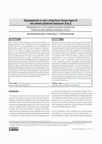 Organogenesis in-vitro using three tissues types of tree tomato [Solanum betaceum (Cav.)] = Organogénesis in-vitro usando tres tipos de tejidos de tomate de árbol [Solanum betaceum (Cav.)]