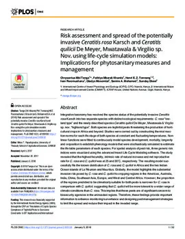 Tanga, C.M. et al., 'Risk assessment and spread of the potentially invasive Ceratitis rosa Karsch and Ceratitis quilicii De Meyer, Mwatawala and Virgilio sp. Nov. using life-cycle simulation models: implications for phytosanitary measures and management', PLOS ONE, vol. 13(1), p. e0189138, Public Library of Science (PLoS), 2018