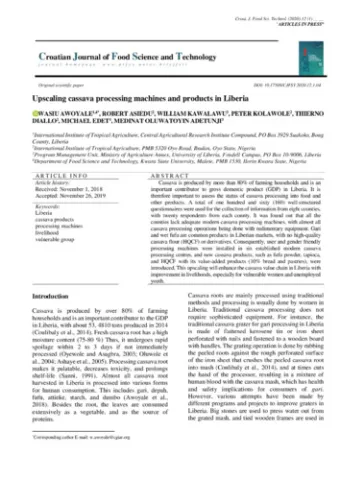 Cassava is produced by more than 80% of farming households and is an important contributor to gross domestic product (GDP) in Liberia. It is therefore important to assess the status of cassava processing into food and other products. A total of one hundred and sixty (160) well-structured questionnaires were used for the collection of information from eight counties, with twenty respondents from each county. It was found out that all the counties lack adequate modern cassava processing machines, with almost all cassava processing operations being done with rudimentary equipment. Gari and wet fufu are common products in Liberian markets, with no high-quality cassava flour (HQCF) or derivatives. Consequently, user and gender friendly processing machines were installed in six established modern cassava processing centres, and new cassava products, such as fufu powder, tapioca, and HQCF with its value-added products (10% bread and pastries), were introduced. This upscaling will enhance the cassava value chain in Liberia with improvement in livelihoods, especially for vulnerable women and unemployed youth.