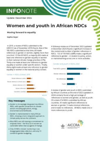 A review of gender and youth in NDCs submitted by African countries at the end of 2022 (updated in December 2024) found a high percentage of references to women and gender, as well as youth. Of a total of 53 NDCs submitted by African countries, 43 made significant references to women or gender. 37 NDCs made one or more references to youth. Gender is increasingly integrated into African NDCs, with specific connections to climate sectors including agriculture, energy, environment and livelihoods. Gender is mainstreamed in many African NDCs, showing a more integrated approach to climate policy across the continent. Most NDCs are still missing a commitment to empowerment – the focus is on women as vulnerable rather than as agents of change. Only 23 NDCs include monitoring or sex- disaggregated data collection, and only 10 commit to gender budgeting.