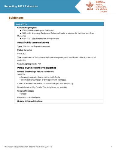 Report / Case study Assessment of the quantitative impacts on poverty and nutrition of PIM's work on social protection
