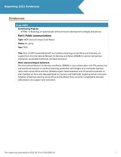 Report / Case study Over 11,000 households benefit from bamboo bioenergy across Africa and Indonesia, via support from the International Network for Bamboo and Rattan (INBAR) for women-led bamboo enterprises, sustainable livelihoods, and land restoration