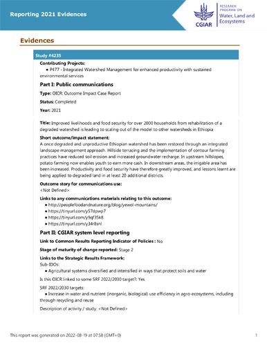 Report / Case study Improved livelihoods and food security for over 2000 households from rehabilitation of a degraded watershed is leading to scaling out of the model to other watersheds in Ethiopia