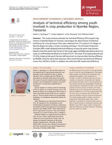 Scientific Publication Analysis of technical efficiency among youth involved in crop production in Njombe Region, Tanzania
