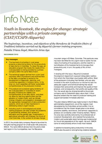 Brief Youth in livestock, the engine for change: strategic partnerships with a private company (CIAT/CCAFS-Alqueria): The beginnings, incentives, and objectives of the Herederos de Tradición (Heirs of Tradition) initiative carried out by Alquería’s farmer training programs.